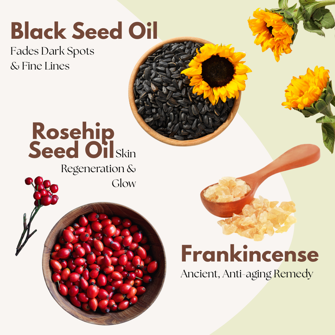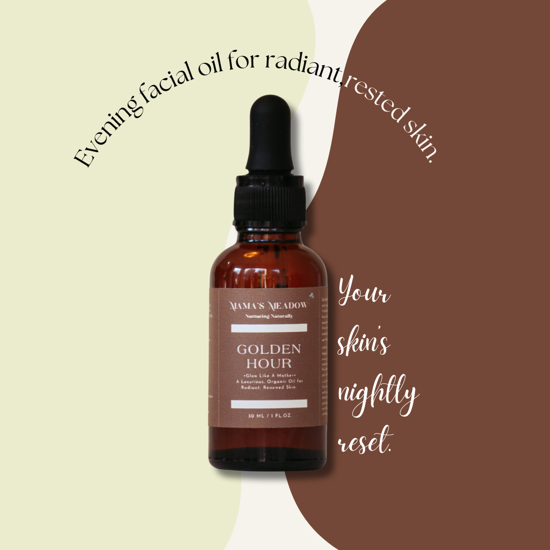 Meet Golden Hour, your evening skincare ritual in a bottle. This luxurious facial oil blends black seed oil, rosehip oil, castor oil, and frankincense essential oil to deeply nourish, restore radiance, and soften fine lines while you sleep. Designed for busy moms who crave effortless skincare, Golden Hour melts into the skin, leaving it hydrated, supple, and naturally glowing by morning.